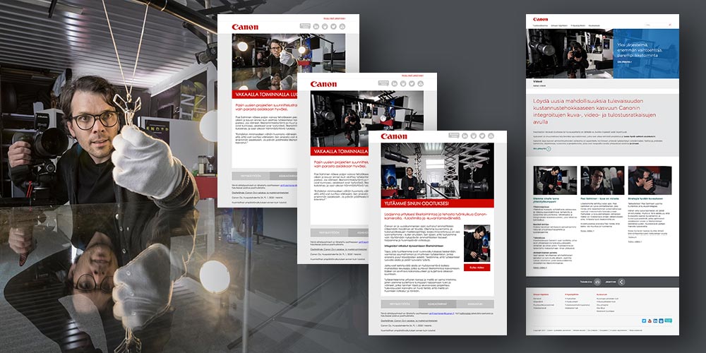 Pasi Salminen, a photographer known worldwide for his innovative work with different aspects of photography, was chosen as the face of Canon for the Nordic countries' content marketing and automation campaign. The target groups consisted of people and companies working with media, PR, marketing and photography. The main goal was to bring awareness and create leads for Canon’s Ecosystem, a complete solution designed for handling multiple photographer and videographer business areas and growing business effectively. This was done with a content marketing program consisting of e-mails leading to a campaign page with three different videos, two of Pasi Salminen giving expert tips on photography using the whole Canon solution and an informative video, as well as a pervasive social media campaign.